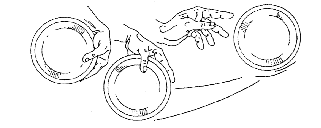 La prise: prenez le disque tête en bas, le pouce est dans le bord intérieur, l'index enroulé sur le bord extérieur, les trois autres doigts sur les rayures. La paume de la main reste vers le bas
